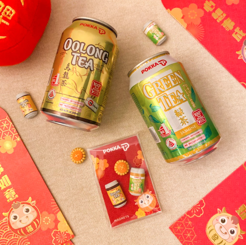 miniature polymer clay Pokka Oolong Tea and Green Tea cans accompanied by the quintessential CNY snack, pineapple tarts to mark this Lunar New Year campaign.