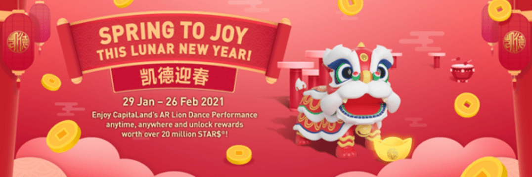 This Lunar New Year, CapitaLand is launching Singapore’s first Augmented Reality (AR) Lion Dance performance, entertaining shoppers anytime and anywhere on their mobile devices, whilst rewarding them at the same time!The Spring to Joy Virtual Lion Dance (凯德迎春) campaign kicks off on 29th January 2021 and will give away over 20 million STAR$® (worth S$20,000 eCapitaVoucher) to lucky shoppers.