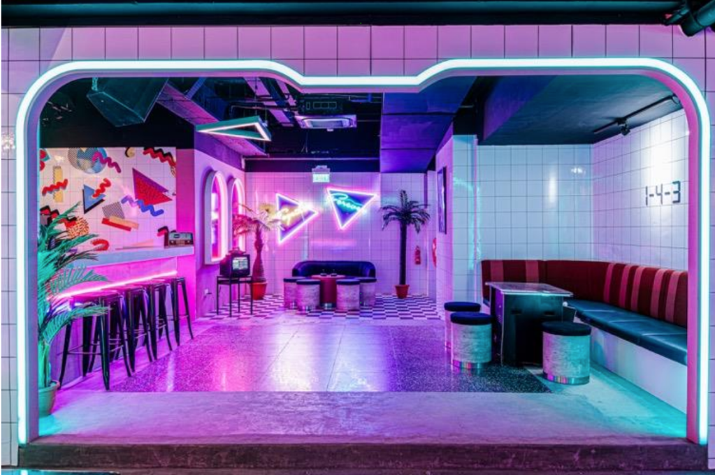 Miami Vice’s tropical vaporwave charm, a Memphis Design bar flanked with curious shapes and forms, an elongated Tron-inspired neon tunnel to signify a time warp, a 16-bit Bruce Lee cove featuring the iconic martial arts legend in his yellow jumpsuit, rows of old school arcade