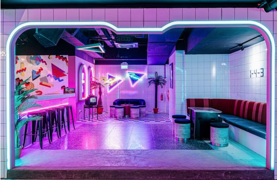 Miami Vice’s tropical vaporwave charm, a Memphis Design bar flanked with curious shapes and forms, an elongated Tron-inspired neon tunnel to signify a time warp, a 16-bit Bruce Lee cove featuring the iconic martial arts legend in his yellow jumpsuit, rows of old school arcade