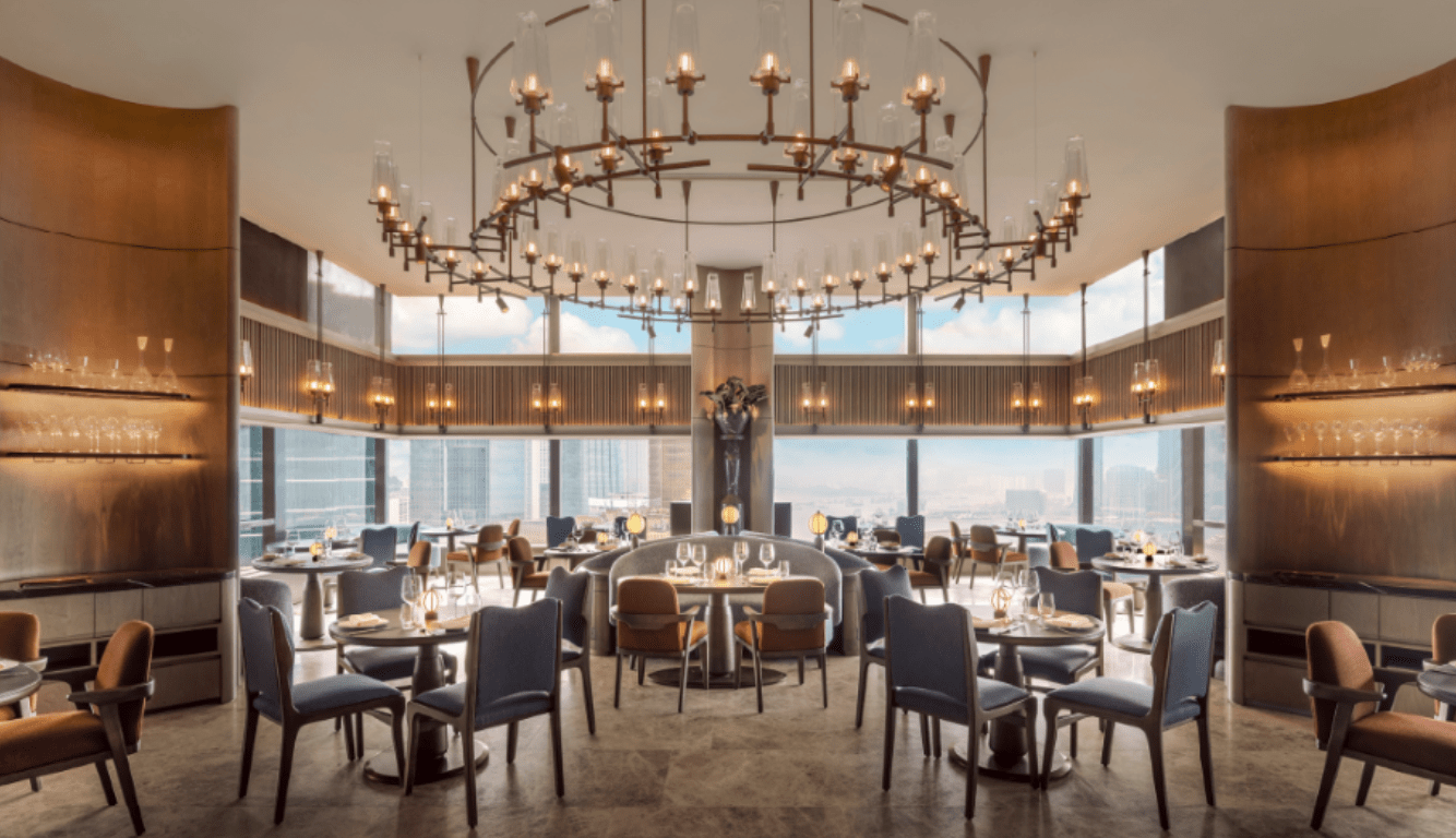 Upon entering from the iconic Sky Bridge, guests are greeted by a full-height bronze gate with bold forms that juxtapose Hong Kong’s urban skyline with mid-century silhouettes. Incorporating a sense of geometry, the main dining room is adorned with a bespoke five-metre chandelier that is made up of over 80 glowing glass lanterns reminiscent of the harbour below.