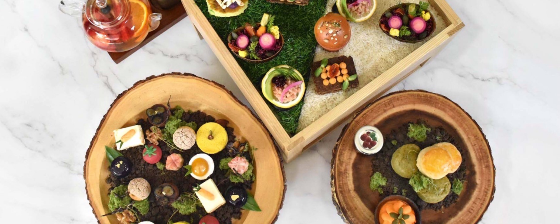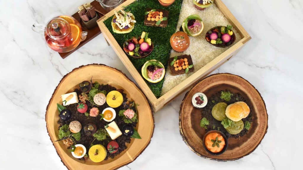 These are accompanied by “The Sweets”, a sublime selection of treats served on a bed of edible chocolate soil. These delicacies include butterfly pea with lemon jelly, dark chocolate & blueberry tart, pumpkin pie, Swiss carrot cake, tomato ‘energy ball’ (muesli, almond, pumpkin & chia seeds), truffle walnut choux cream, flower chocolate pralines of the day, mini sago exotic delight, matcha scones, classic scones, and maple syrup Chantilly cream.