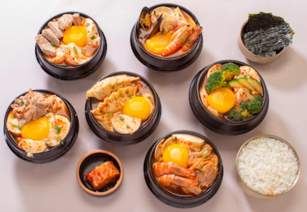 Customers can choose from six types of soft tofu sets, all of which comes with kimchi, rice and a pack of Korean seaweed: