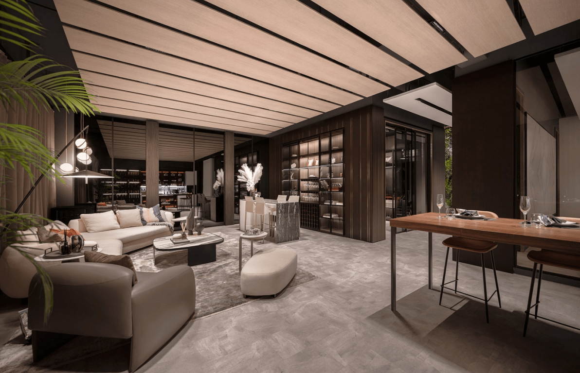 The material palette of the showroom is in a timeless combination of black glass, clean architectural lines with a visually fully open concept. Working on a limited area, walls were removed and large panes of glass were used to divide the spaces. Black mirror lines the breadth of the showroom to create an illusion of double the area of the main hall. The ceiling lines of repeated suspended wood panelled ceilings create the illusion length of the main showroom. The entire showroom is visible from the main door while the various zones are clearly demarcated into living lounge, bar, walk-in wardrobe, kitchen as well as dining area.