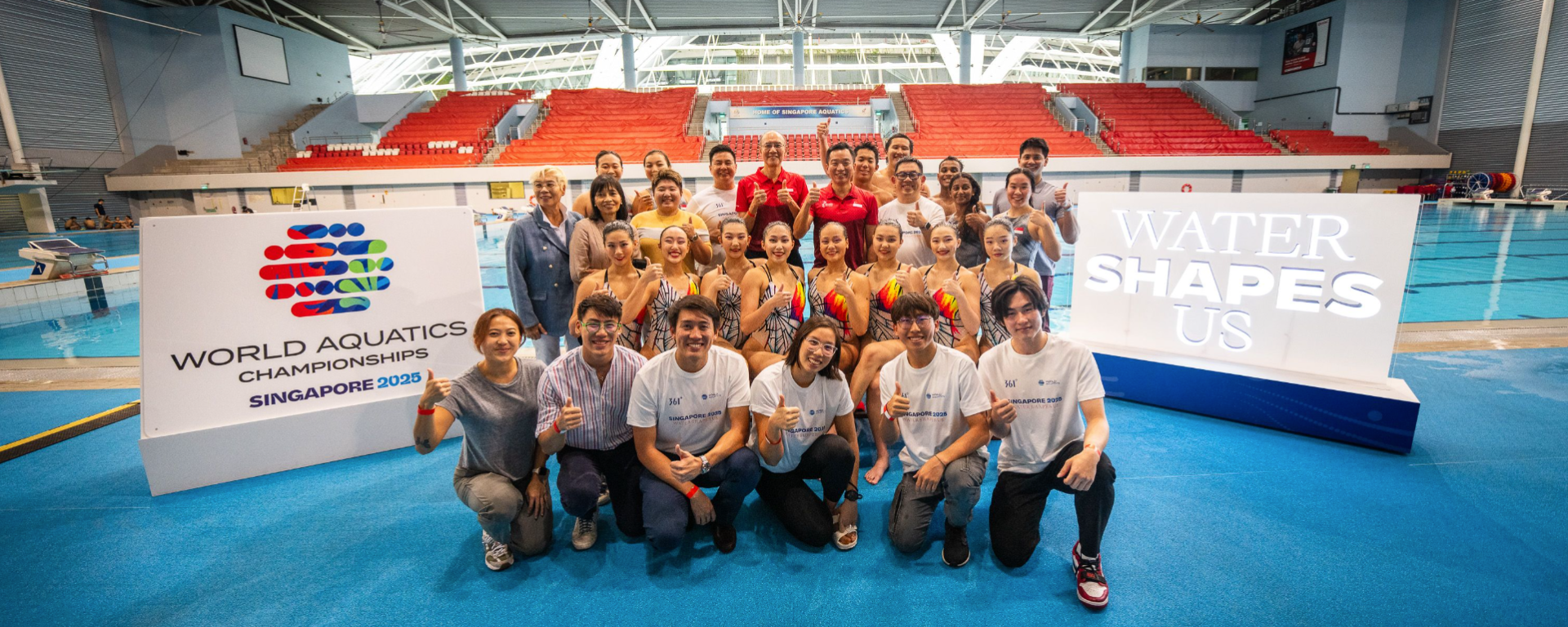 Come 11 July 2025, Singapore will be hosting over 2,500 of the world’s best aquatics athletes across six sports at the World Aquatics Championships – Singapore 2025. At the one-year countdown event, Guest-of-Honour Mr Eric Chua, Senior Parliamentary Secretary for Culture, Community and Youth & Social and Family Development , together with the co-chairs of the Singapore 2025 organising committee , unveiled the Singapore 2025 logo and tagline, ‘Water Shapes Us ’, at the OCBC Aquatic Centre. The event was attended by about 80 athletes and officials from the aquatics fraternity.